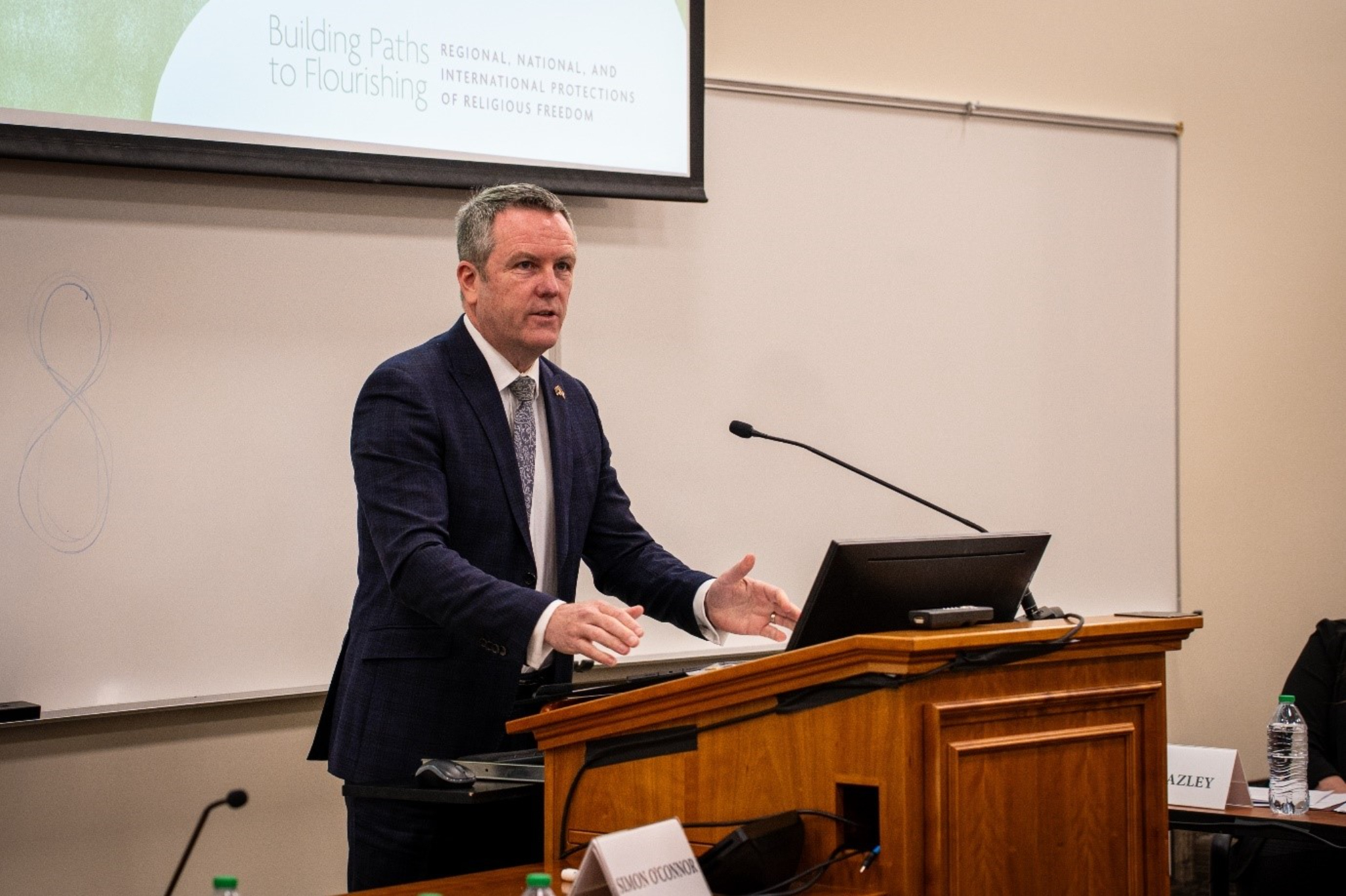 Simon O'Connor speaking at the 32nd Annual International Law and Religion Symposium on 7 October 2025© 2025 by Intellectual Reserve, Inc. All rights reserved.Delegates also offered practical ways that individuals, churches, and governments can help protect these rights.